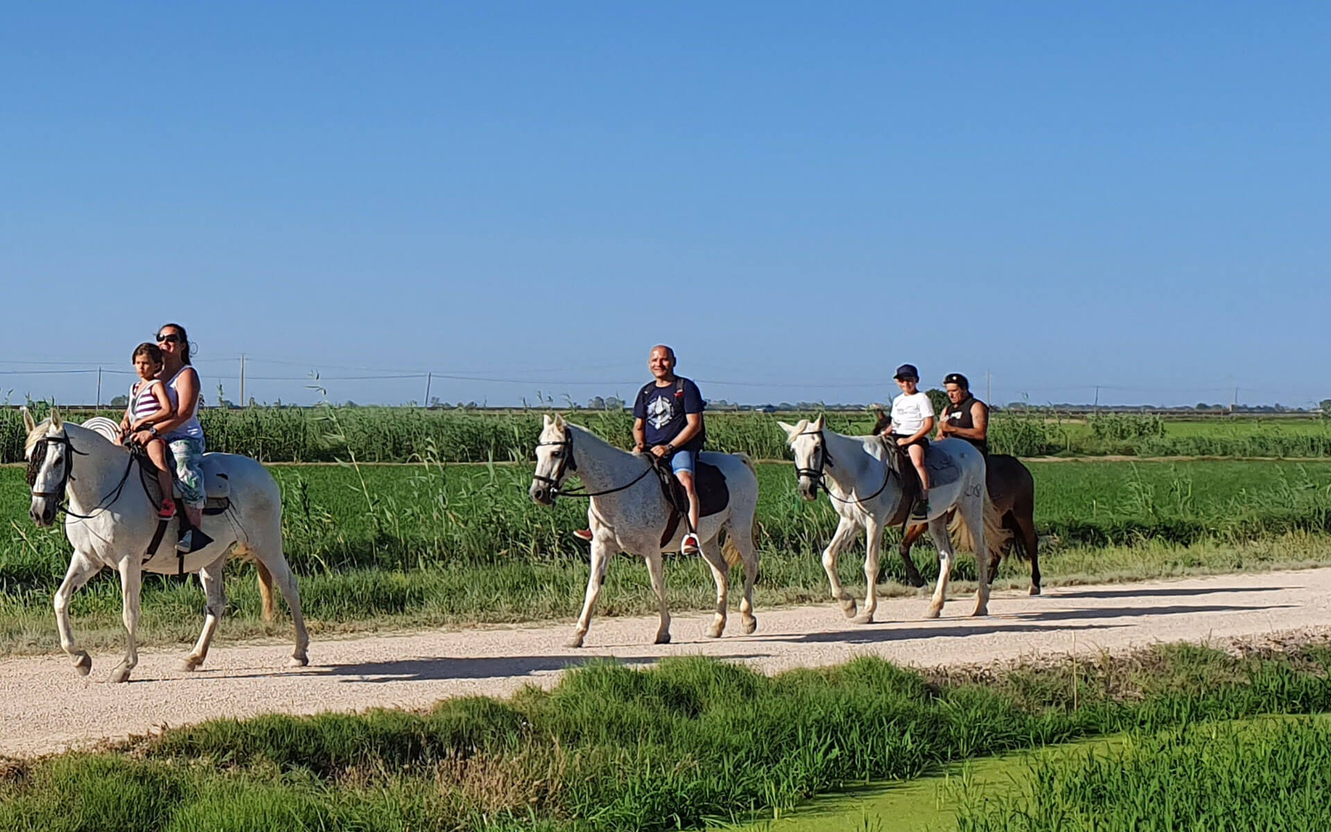 Excursión a caballo familiar apta para todos los públicos, incluido niños. Se trata de una ruta tranquila muy divertida para disfrutar del entorno y los campos de arroz que tenemos en el Delta del Ebro.